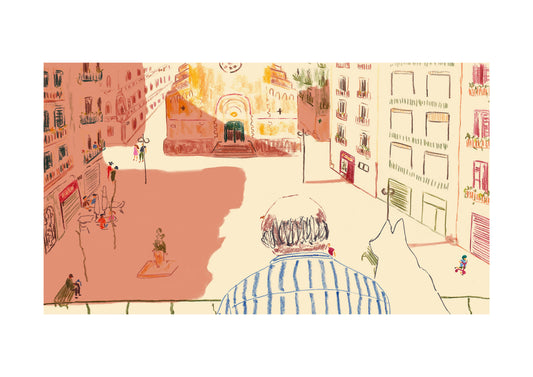 Man and his dog watching the world go by in Gracia